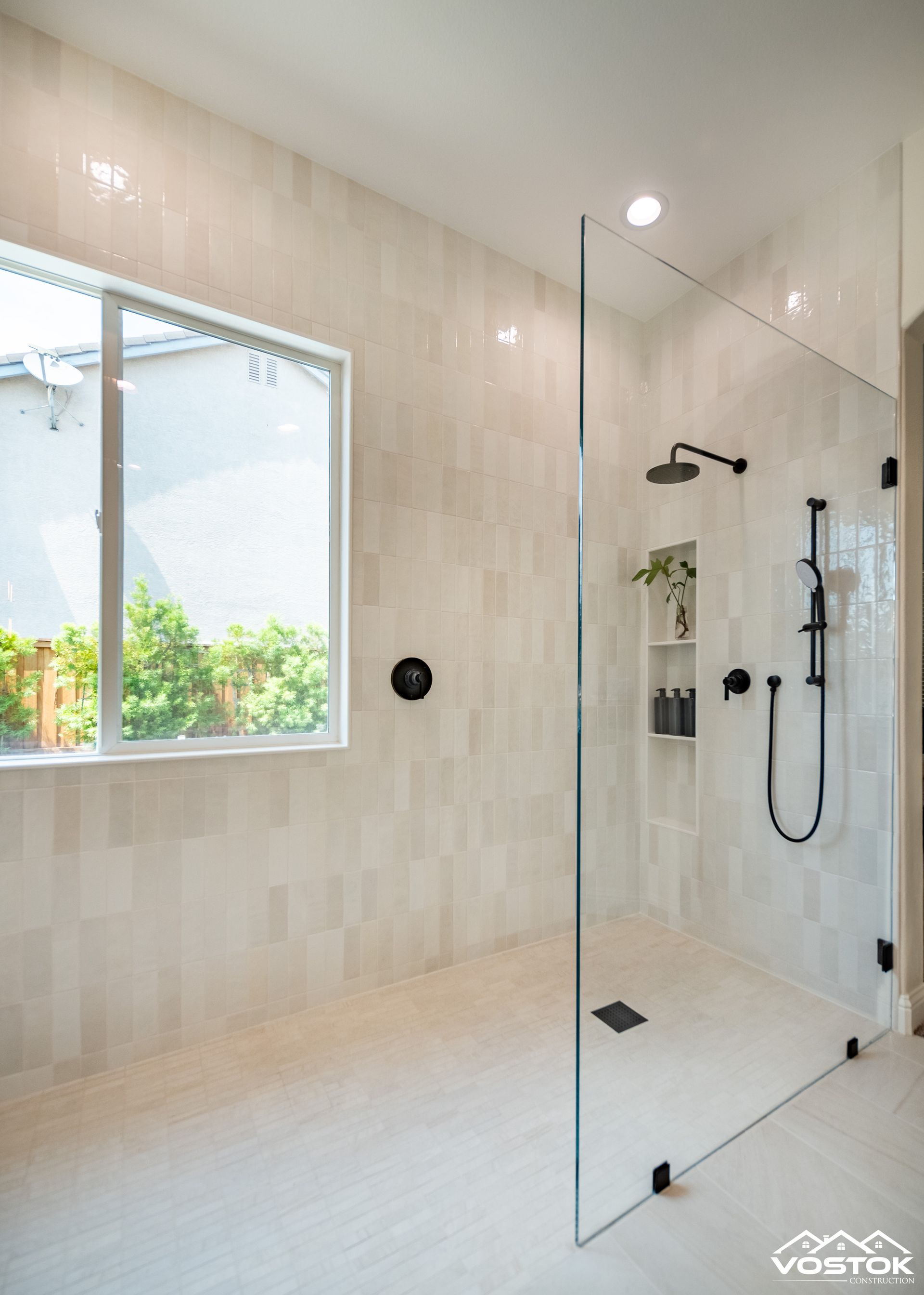 Full primary bathroom remodel with warm tones and dark accents that complete the beautiful space.