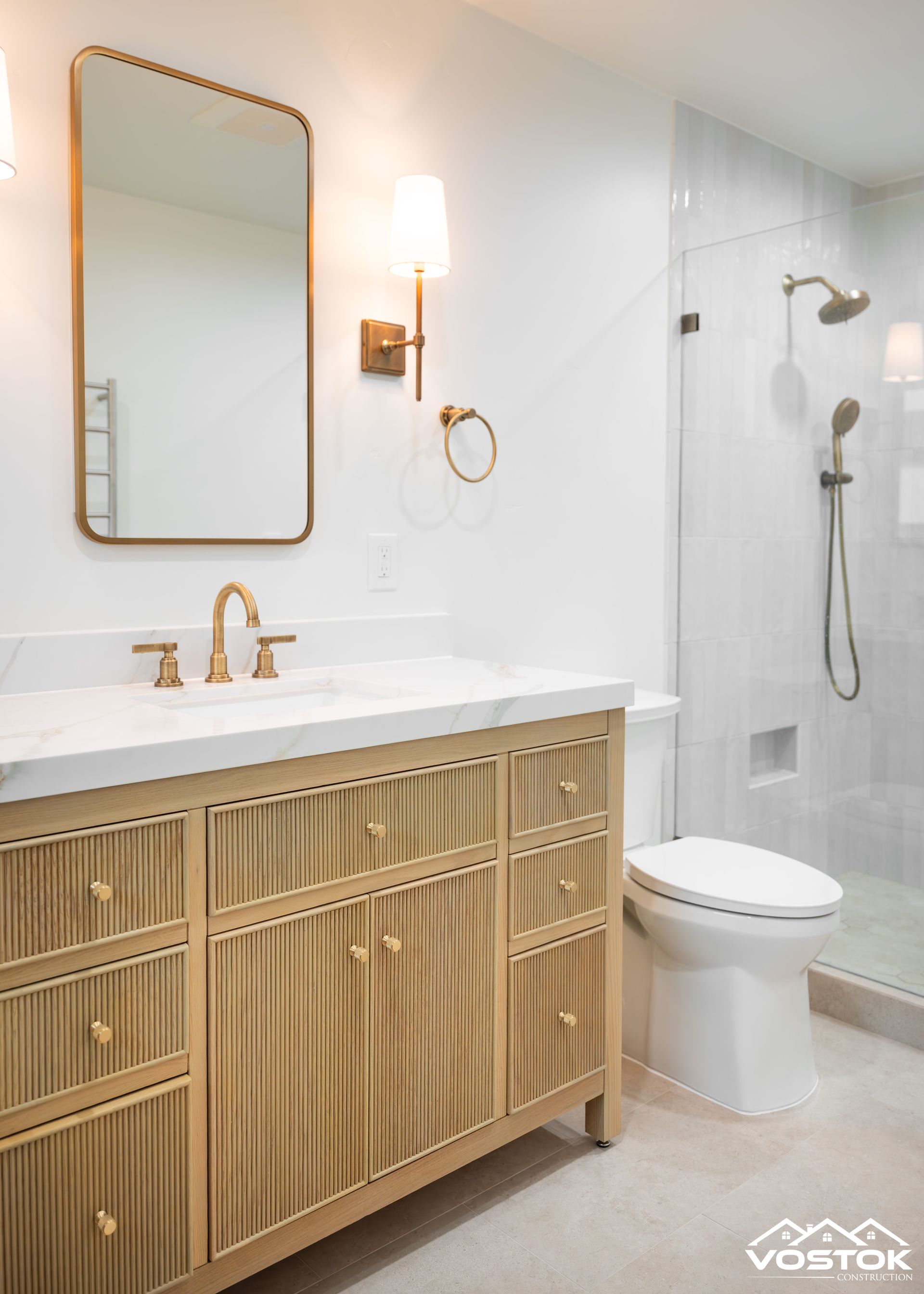 Warm natural white oak vanity cabinetry with brushed brass hardware complemented by sleek white quartz countertops and subtle veined marble-look wall tile.