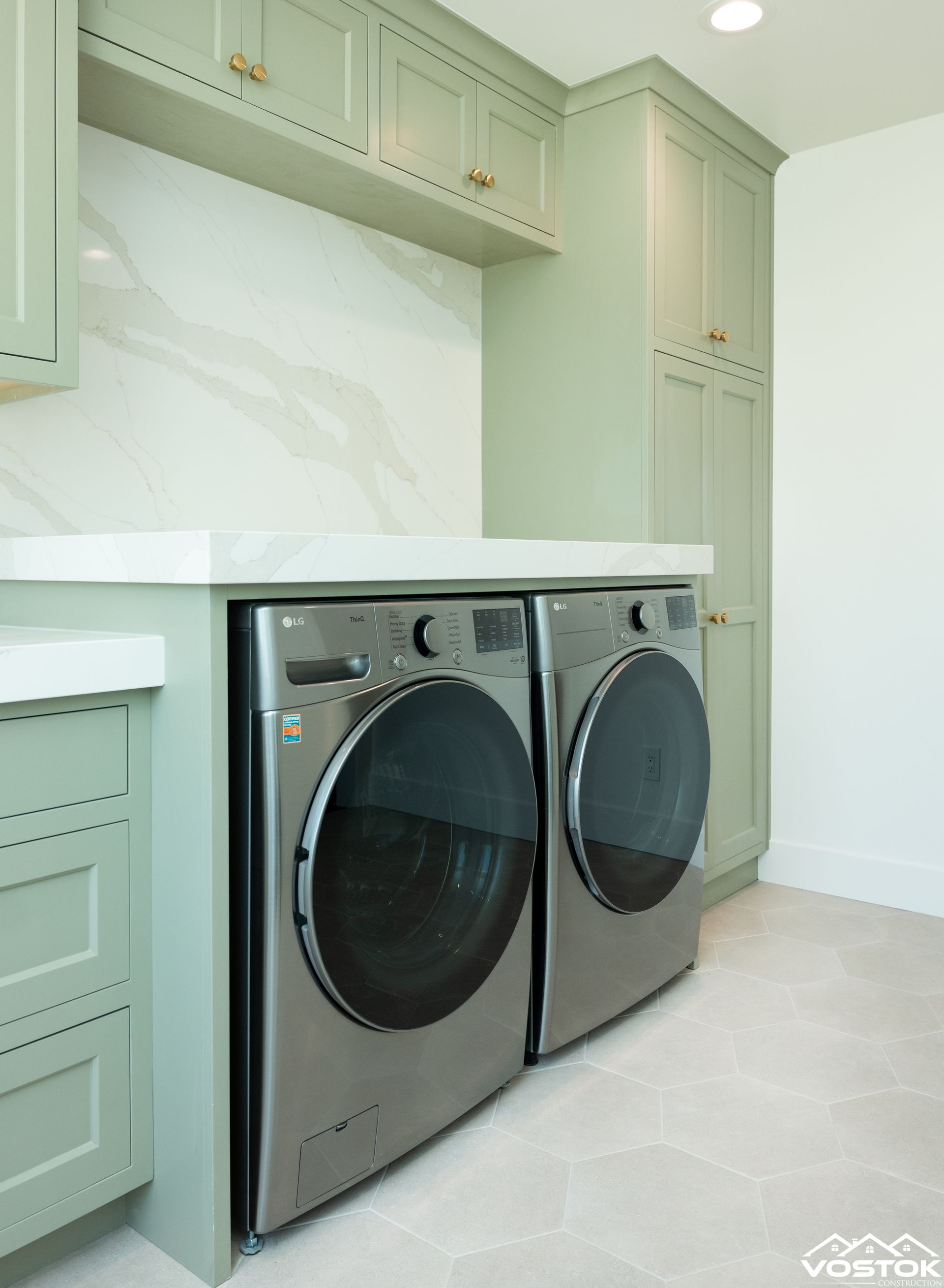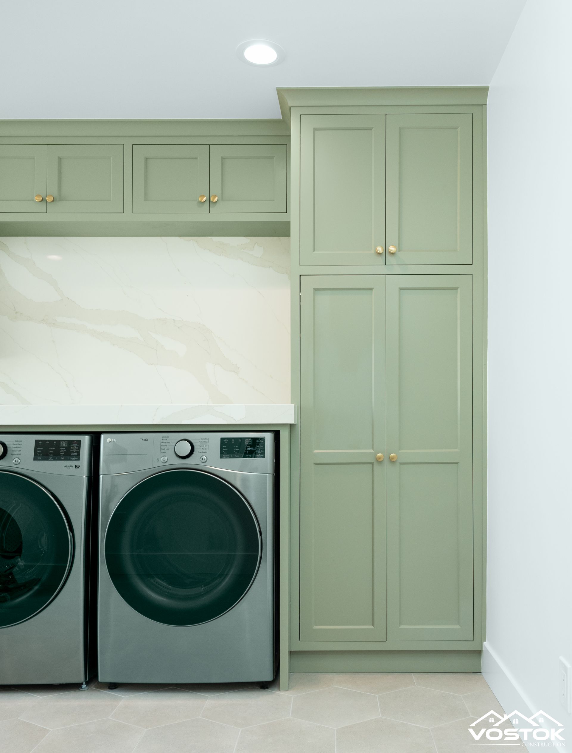 The laundry room features custom-painted shaker cabinets in a serene sage-green tone, delivering timeless style and exceptional durability with premium soft-close hinges and drawers. Accented with warm brushed brass pulls and knobs, the cabinetry is elevated by a seamless full-height quartz backsplash and countertop in a classic white marble pattern, creating a bright, luxurious, and easy-to-clean space that blends functionality with sophisticated design.